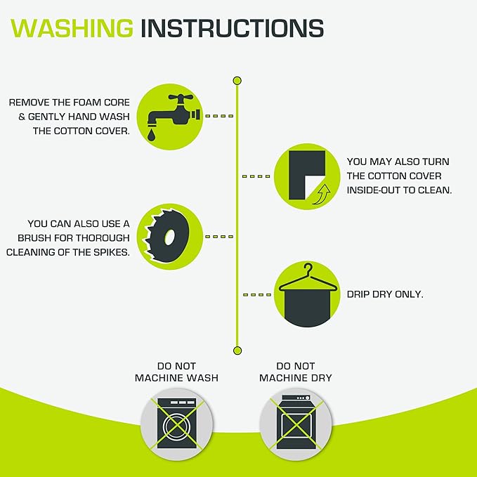 - Product Care Instructions : Store your Acupressure Mat and Pillow in a cool, dry place. To clean, remove the foam core and and gently hand wash the cotton cover. You may also turn the cotton cover inside-out to clean. Do not machine wash or dry, as this may damage the pressure point buttons. Drip dry only. Store your Acupressure Mat and Pillow in a cool, dry place. To clean, remove the foam core and and gently hand wash the cotton cover. You may also turn the cotton cover inside… See more