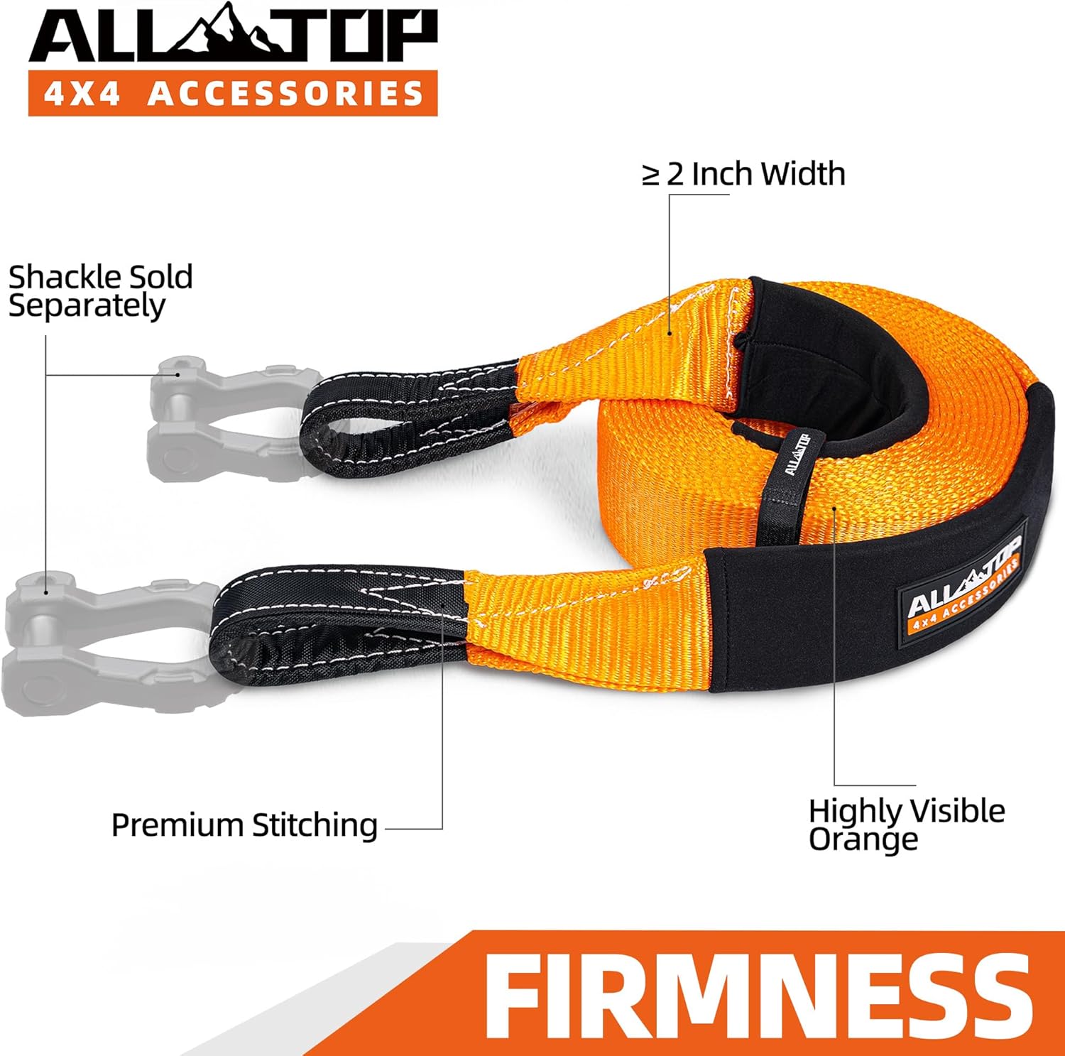 - 【KINETIC SNATCHING】Length: 30 feet / 9 meter. Width: 4 inches / 102 mm. Color: High-Visible Orange for Clear Visibility & Safer Recovery. Strap Webbing: 100% Nylon N66. ALL-TOP Recovery Strap Webbing is like a rubber band, by its 22% elasticity, generates Kinetic Snatching Force helping you and your friends get unstucked.