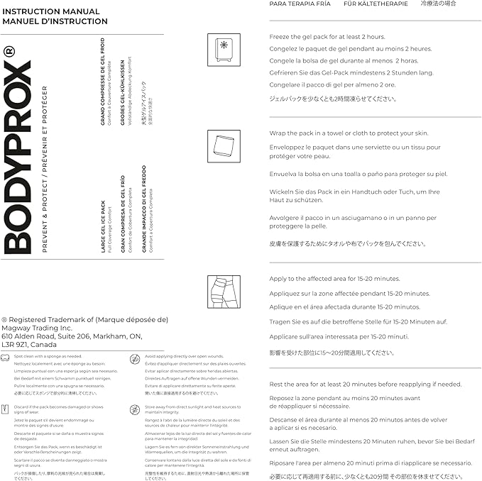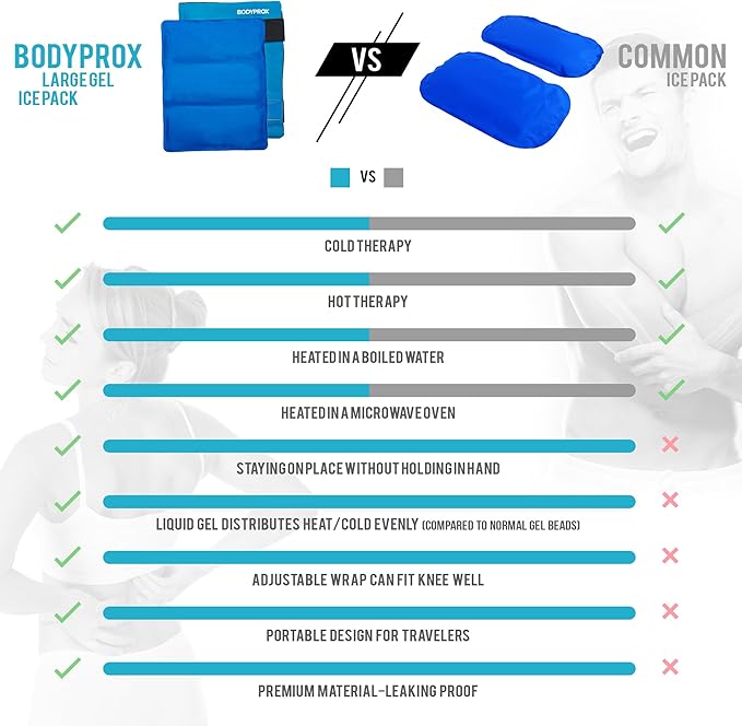- Easily heated or cooled with gel that stays soft to mold to your body for the most effective relief. The Bodyprox Large Ice Pack uses a premium gel that stays hot or cold longer than traditional ice packs. Ice pack is approx. 11” x 14” in size, and the straps are elasticized for a universal fit.