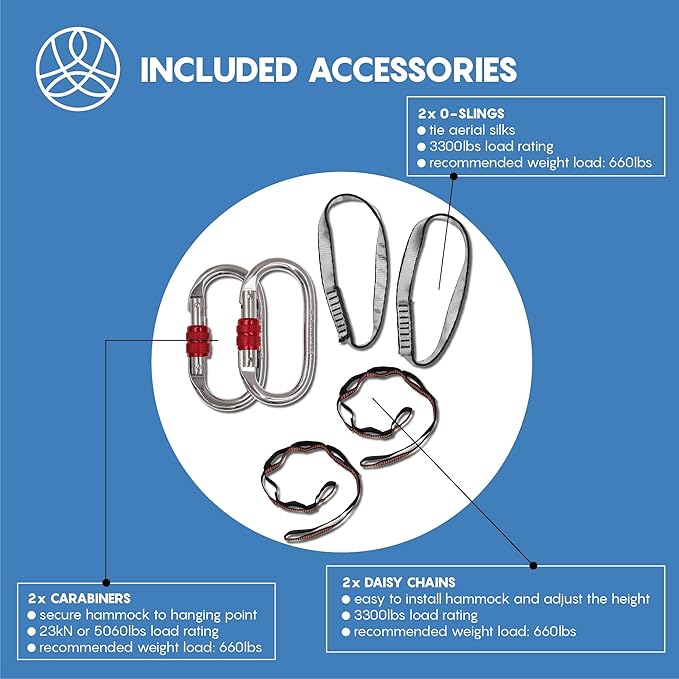 - ✔ BONUS VALUE: Includes complete set of aerial silk (13x9 ft), 2 carabiners, 2 extension straps (3 ft), 2 o-slings, and a manual guide. ⚠️Mounting rig is NOT INCLUDED⚠️