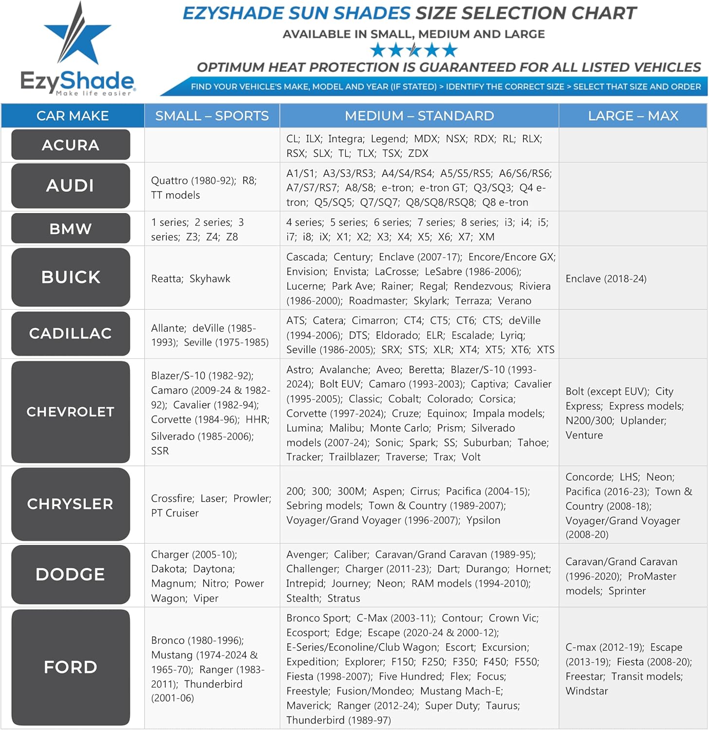 EzyShade Windshield Sun Shade with Shield-X Reflective Technology. See Vehicle Size-Chart. Foldable Car Sunshade for Front Windshield Window Car SUV Van Truck. Sun Visor Heat Shield. Max (L) Size