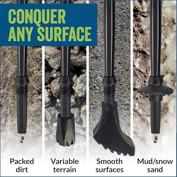 - THREE DESIGN CHOICES: Unique design provides stability for all types of hiking and walking. Choose Round for regular walking and hiking. Nordic Medium for power walking with maximum grip OR Extra Firm for a stiffer tip with maximum durability