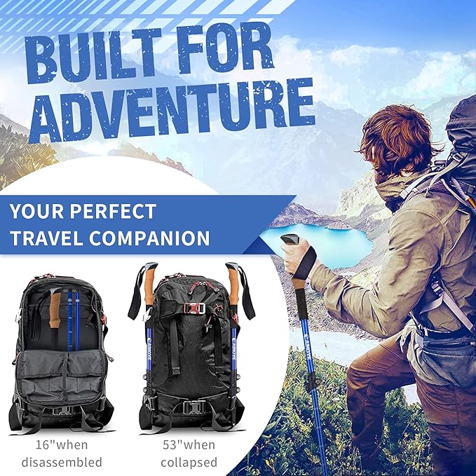 - Collapsible & Lightweight- These Hiking Poles Adopt Four Sections Design, Can Be Folded Into Four Sections, Only 17 Inches When Disassembled, Small And Light Enough To Be Stored Within Your Backpack Or Fit Well In Any Suitcase, Leaving You Place For The Trekking Gear Or Personal Gear, Each Pole Only Weight 9.8 Ounces, Poles Are Extendable From 22 To 51 Inches, Perfect Fit For Men, Women, Children And Seniors