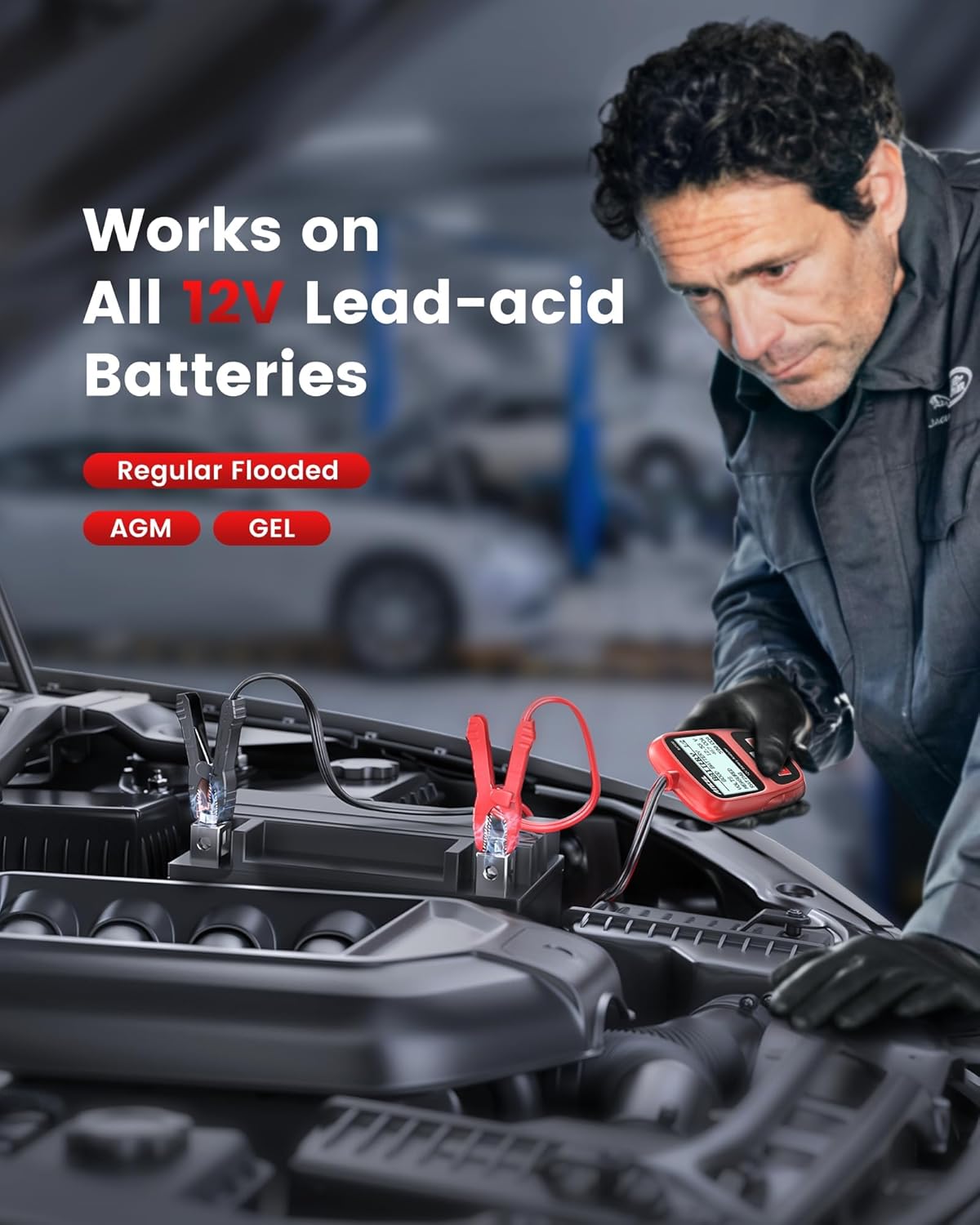 - 🔋【WIDER TESTING RANGE】Car battery tester works on 12V lead-acid batteries, Battery tester 12V automotive including regular flooded, AGM flat plate, AGM spiral, and GEL batteries for cars, RV, SUV, motorcycle, boats, light truck, and even golf carts. Battery testers give you an accurate result in merely seconds, such as CCA value, CCA rating, voltage, internal resistance, state of health, and state of charge, based on the rating standard of CCA, CA, MCA, JIS, DIN, IEC, EN and SAE