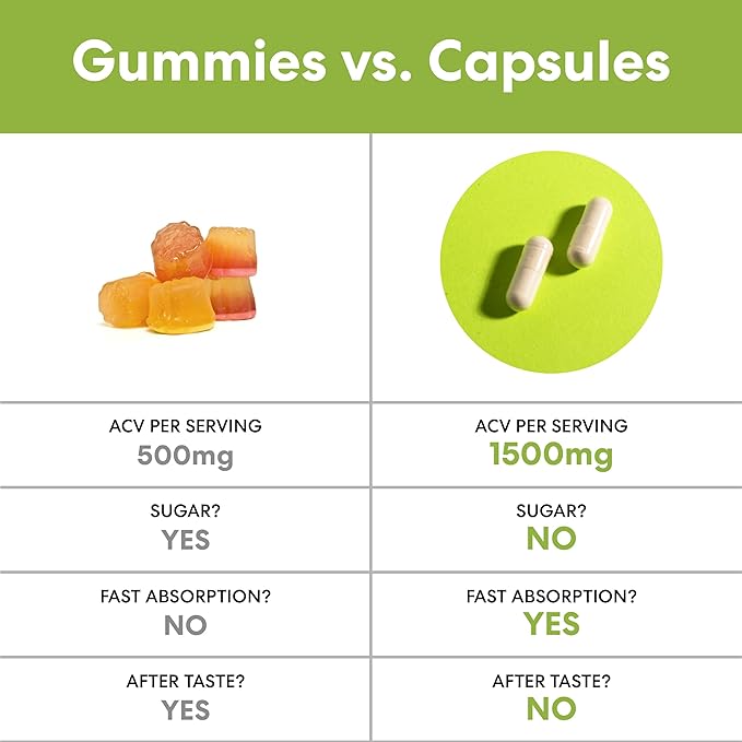- Convenient Capsules: Enjoy the benefits of apple cider vinegar without the strong taste or smell, thanks to our easy-to-swallow pills. More potent than gummies.