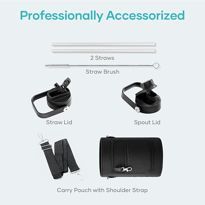 - What You Get: BUZIO 64oz Water Bottle, Straw Lid, Flex Lid, 2 x Straws, Bottle Brush, our worry-free lifetime warranty and friendly customer service