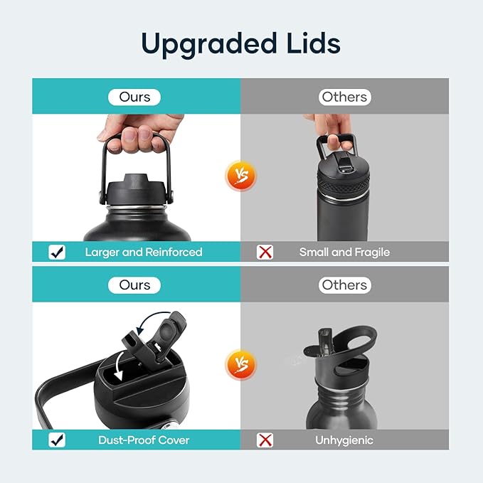 - 2 Caps Pack: This 64 oz stainless steel water bottle comes with straw lid and flex cap, the flex cap is perfect for the beach, camping and hiking, while the straw lid is suitable for cycling and road trip