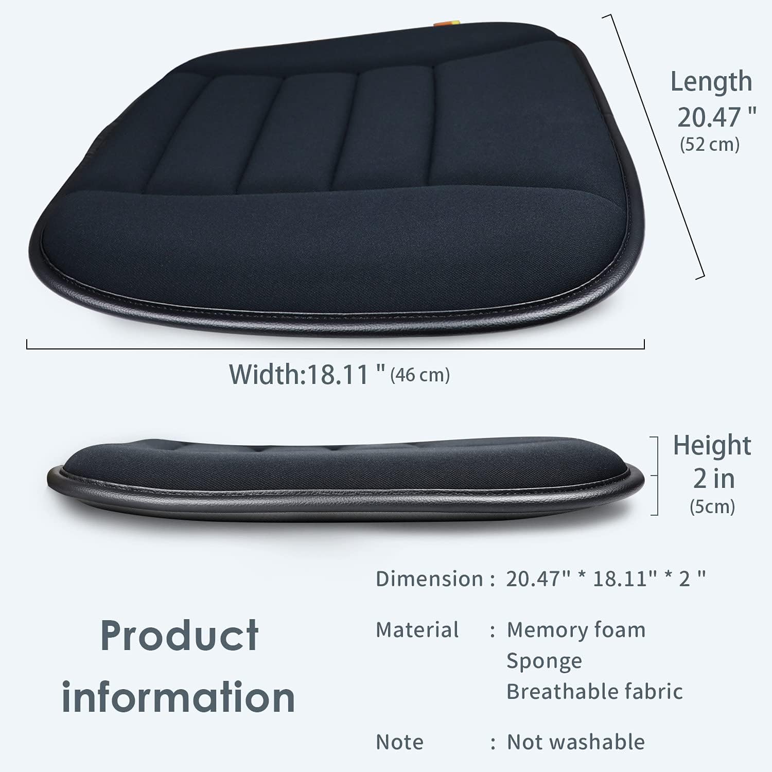 - ★【Designed For Your Seat】The auto seat cushion has a size of 20.47"*18.11", The seat cushion with thickened 2.0 inch thickness adopts 3 layers design, suitable for most car seats. The seat cushion adopts patented memory foam technology (rebound time 3-5 seconds) . The sewing thread is neat and smooth. It is equiped with a super-quality leather edge. The seat cushion is scratch-resistant, wear-resistant and durable. It will not lose its shape or loose threads and abrase edges after washing.