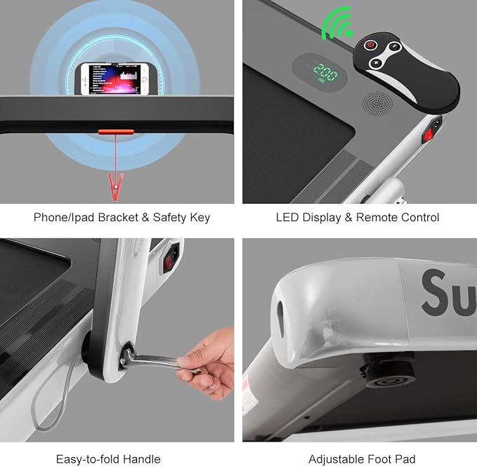- 【Spacious Running Belt & LED Display & Phone Bracket】 Excellent load-bearing capacity together with the wide and non-slip running area will improve safety during your workout. The LED display helps you clearly see your movement time, speed, distance and calories. Besides, the phone holder allows you to exercise while entertaining.