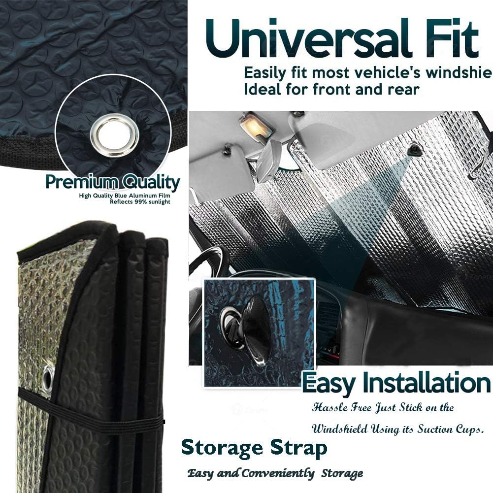 - PREMIUM MATERIAL - Windshield shade Reflective aluminum foil combine with double layer bubble material make the cooling effect is more significant,Frost and snow prevention Dust-proof.