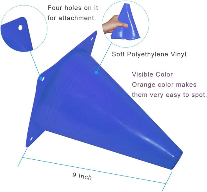 • Size - measures 9 inches in height, 5.5 inches in diameter. Four holes on marker cones for attachment, if it is a windy day, you do not need to worry it will blow all over the place.