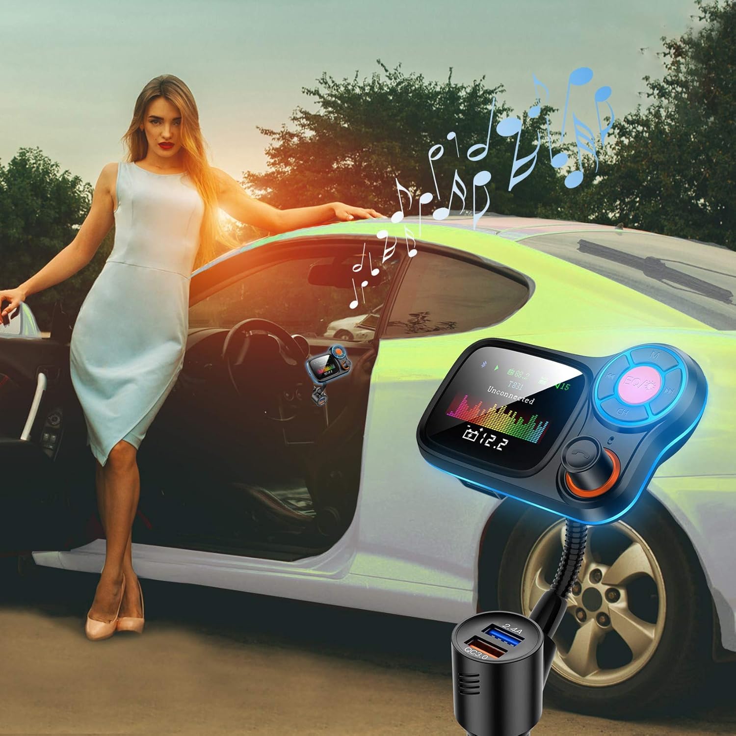 - DUAL USB CHARGING: The car charger is equipped with a QC3.0 and 2.4A charging port, Input 12-24 V, supports 2 USB ports to charge 2 devices simultaneously. The smart output current pairs most cellphones or tablets. Safely charge your device without damage to the battery with this Bluetooth radio transmitter.