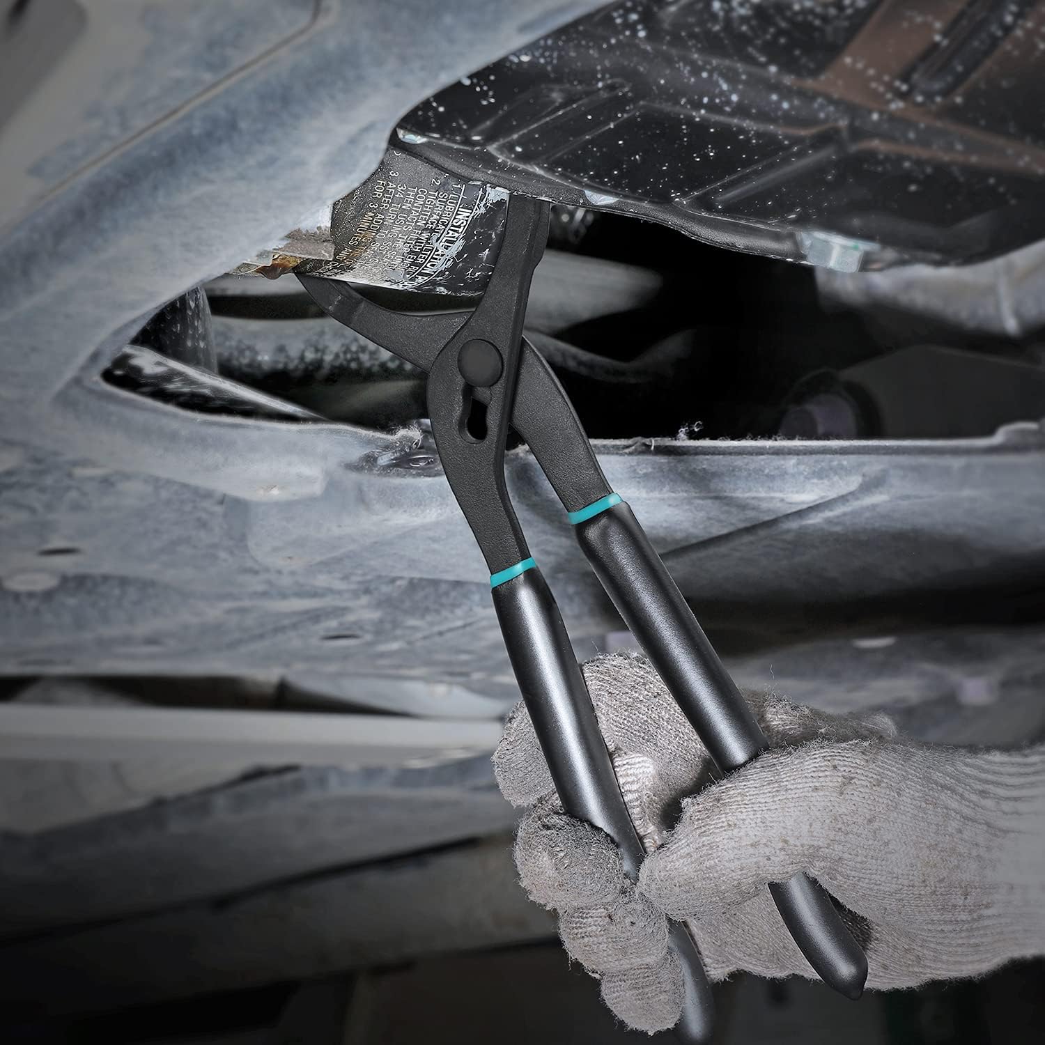- The oil filter pliers are designed with 2-position slip joints, with strong jaws and serrated teeth, which can clamp the oil filter stably. 12 inches long handle, which can provide you with soft and comfortable touch and non-slip control. The long handle provides easy access to restricted areas, providing more effective leverage for increased torque, a must have for any auto mechanic