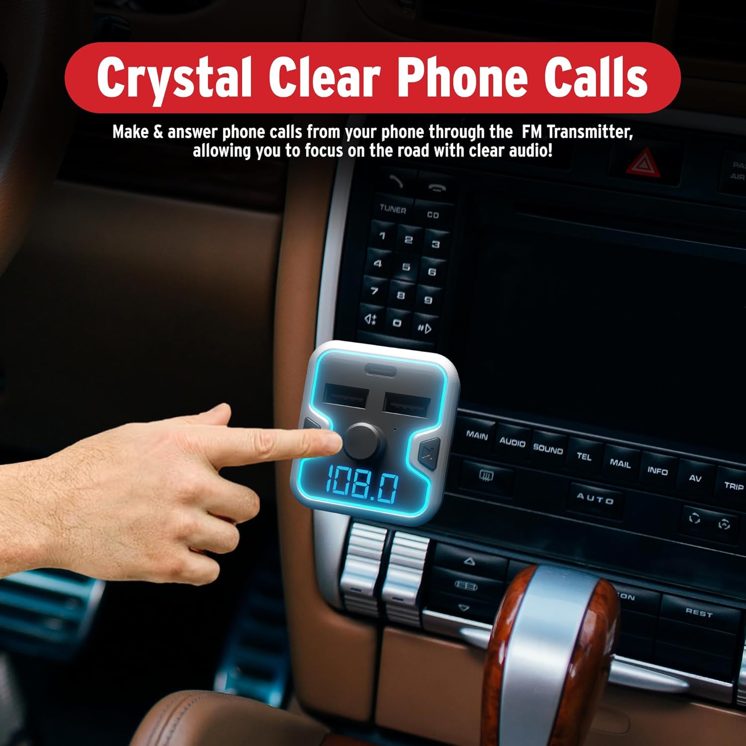 Car and Driver Bluetooth 5.0 FM Transmitter Charger, Dual USB-A and USB-C Lighter Adapter, Triple-Port Design with Fast Charging, Compatible with Mobile Alexa, Siri, and Google Assistant