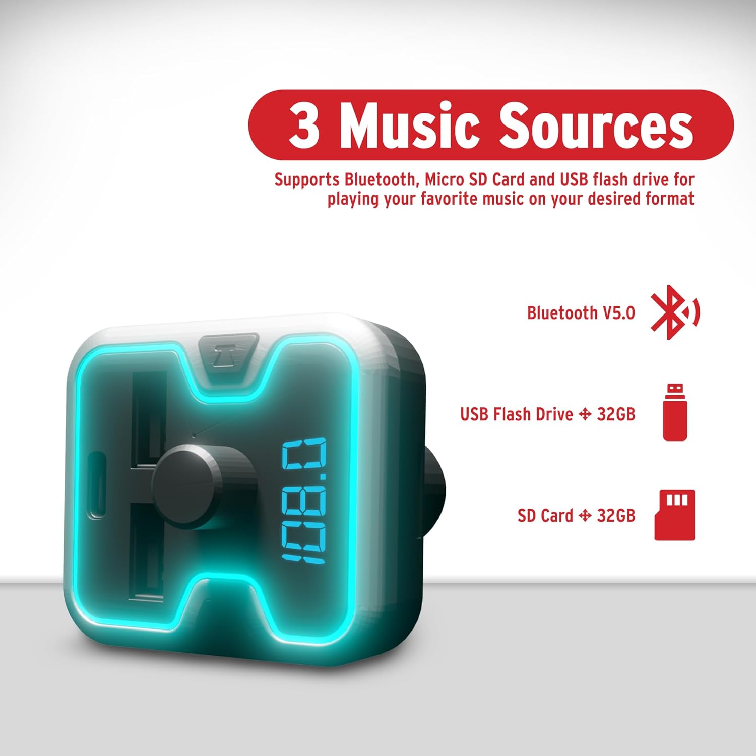 - ILLUMINATED LED ACCENT & DISPLAY: Our fast-charging car Bluetooth adapter is designed with a multicolor light border that has 7 neon-color backlit options to enhance your car’s interior. It also has a built-in LED display that shows the current FM frequency and the car’s battery voltage.