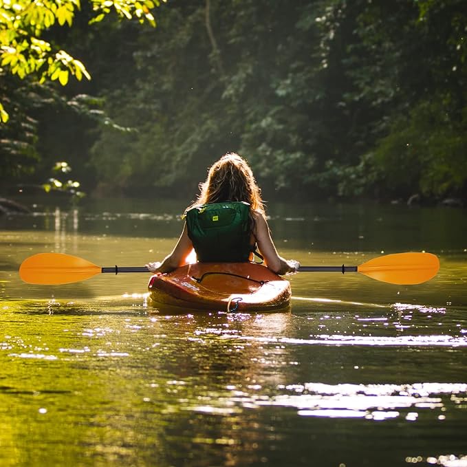 • CARBON DESIGN - LIGHTWEIGHT & DURABLE: Made of premium quality 1.25mm thick, 29mm diameter carbon fiber composite shaft, and fiberglass reinforced polypropylene blades, this kayak paddle is impact and erosion resistent, thus for great durability. It weighs only 33 oz, and is perfect for beginner and intermediate kayakers.