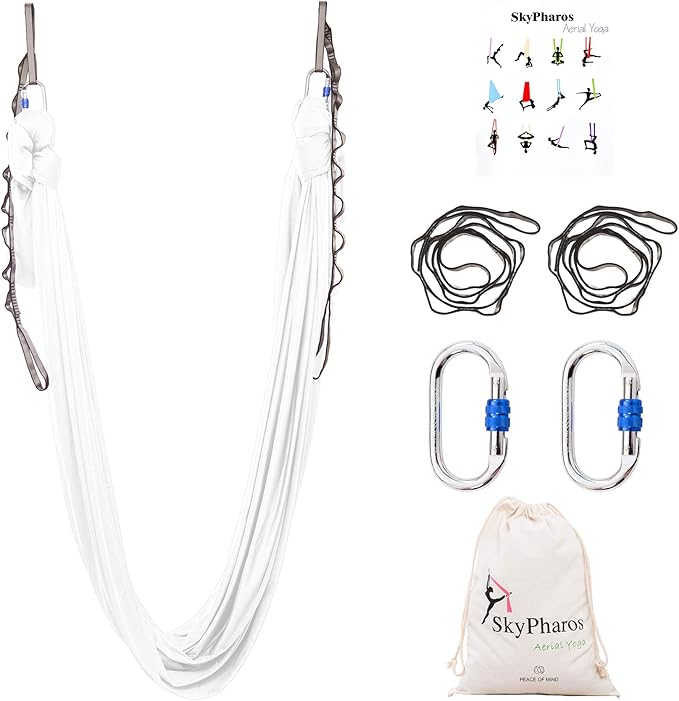 - HEAVY-DUTY HARDWARE - The flying yoga hammock includes ALL THE HEAVY-DUTY hardware required to safely install it yourself. You will get 5.5 yards aerial silk, 2 x daisy chains,2 x Steel Carabiners, 1 x Pose Guide, 1 x carry bag. They are strength and safety certified with high weight-load capacities.