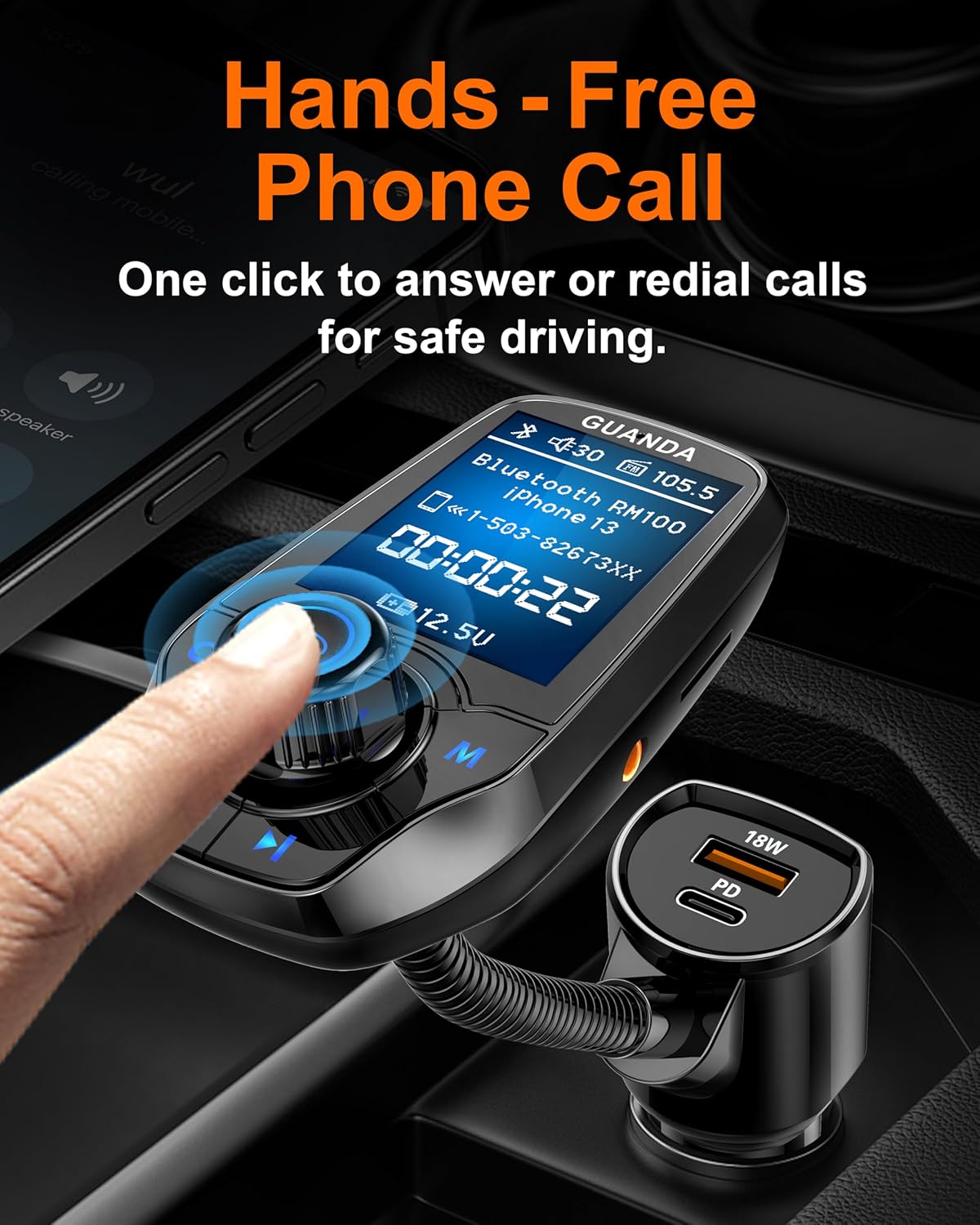 - ADVANCED 1.8" DIGITAL COLORFUL LCD DISPLAY: Via Our Bluetooth FM transmitters for car, more indicators can be clearly seen, such as Bluetooth name, FM stations, connected device's name, car voltage, music name, music amount, colorful and lively music spectrum, play status, volume etc. Meanwhile, car radio adapter Bluetooth transmitter adopts rotated 360-degree flexible elegant gooseneck design.