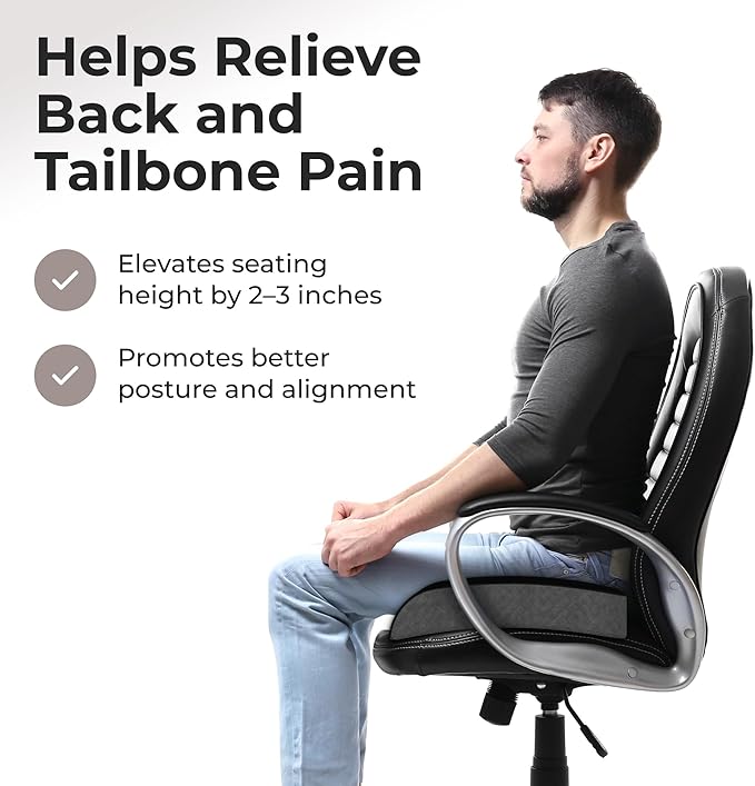- LIFTING CUSHION - PAIN RELIEF: Lifts seating height 2-3 inches. Whether in the car, the office, or on your favorite chair, The Kӧlbs Comfort Seat Cushion is sure to offer you hours of seating comfort. Ideal for post-surgery, hemorrhoids, back pain, leg pain, sciatica, memory foam seat cushions for office chairs, or any time extra seating comfort is needed. Use as a car seat cushion, desk chair cushion, wheelchair cushion or coccyx seat cushion. From Kӧlbs, the leader in medical seat cushions.