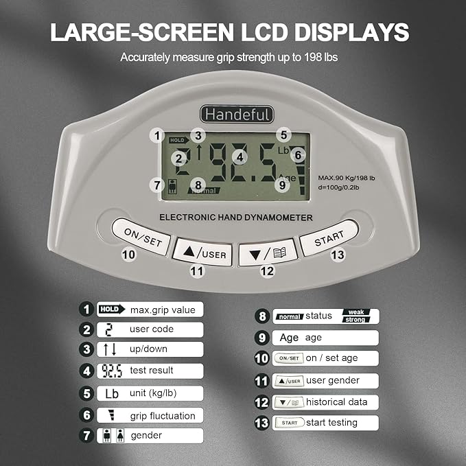 - [LCD Display] - Large LCD screen shows all measurements clearly on the same screen. Displayed measurements include user code, age, gender, grip value in pound or kg, and grip status. A maximum grip value display and weak, normal or strong power levels can be saved and easily recalled for comparison.