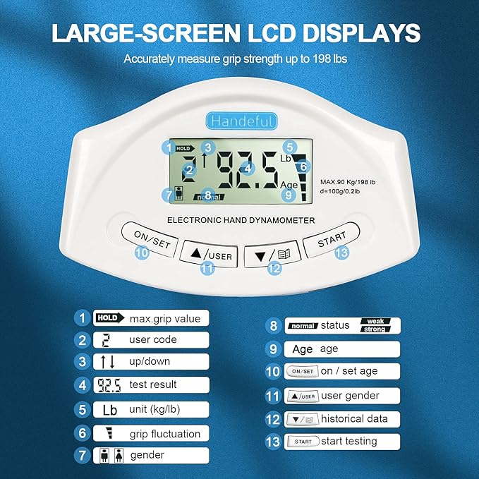 - [LCD Display] - Large LCD screen shows all measurements clearly on the same screen. Displayed measurements include user code, age, gender, grip value in pound or kg, and grip status. A maximum grip value display and weak, normal or strong power levels can be saved and easily recalled for comparison.