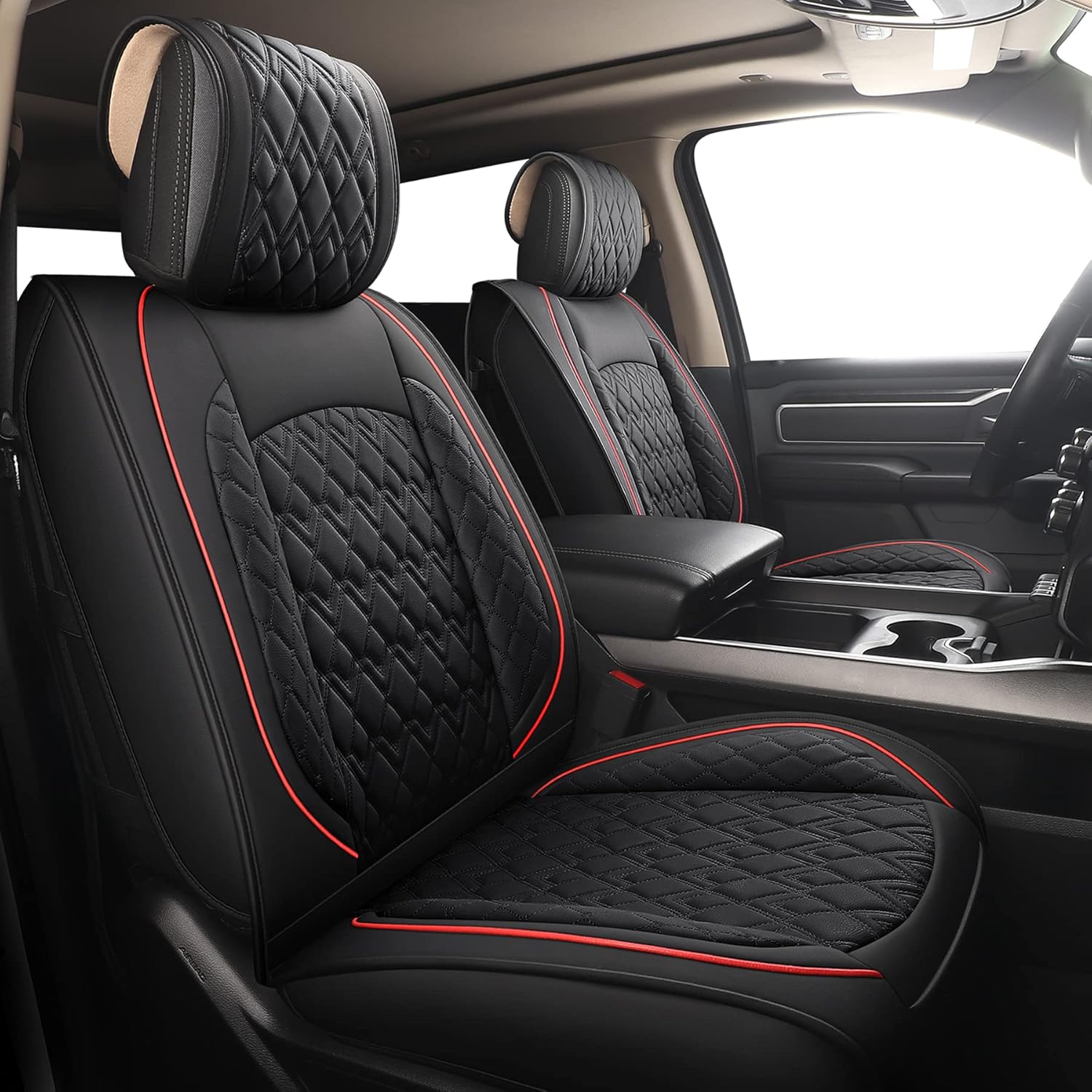 JOJOBAY Car Seat Covers for Dodge Ram Full Set,Fit Ram 2009-2025 1500/2500/3500 Pick-up Truck,Crew,Regular,Quad,Mega Cab,Waterproof Leather Seat Covers Protectors(5 PCS Full Set,Black/Red)
