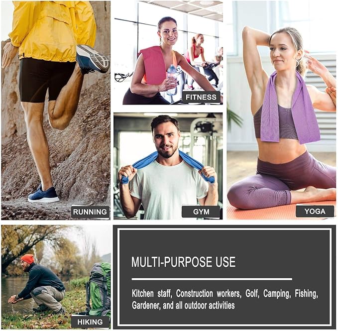 - Versatile Use: Perfect for fitness enthusiasts and outdoor workers, this cooling towel is designed for activities like yoga, sports, swimming, gym workouts, golf, camping, and more. It helps prevent sunburn and heat stroke by providing a refreshing cooling sensation. Additionally, it can be used to soothe headaches caused by fever and cool down burns. This towel is an excellent workout gifts for men or gifts for gym men and women, doubling as sweat towels for gym for women or workout towels for women. It’s also a great addition to fitness accessories.