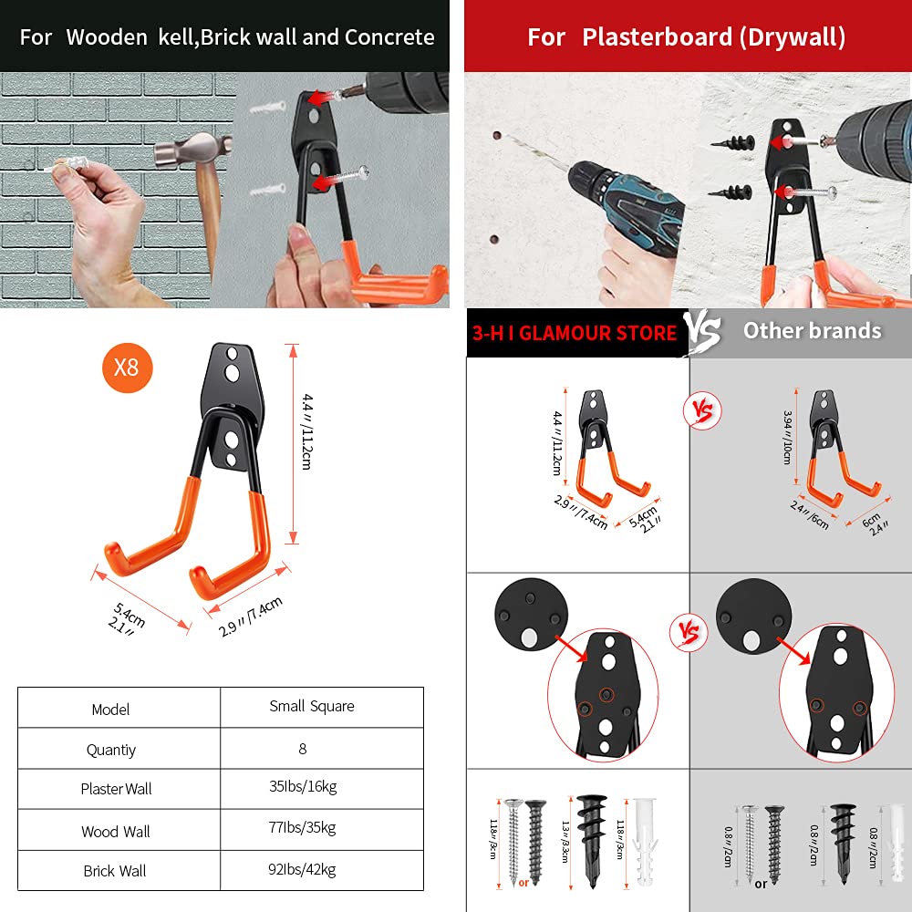 - PERFECT FOR HEAVY OBJECTS –Garage hooks is a set of 8 wall mounted double hooks,8 small U hook . The extended length and anti-slip coating let you organise and hang heavy objects for up to 80lbs.