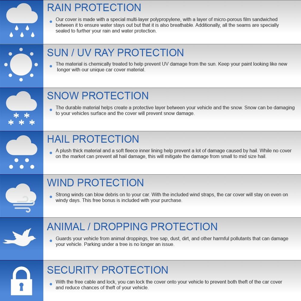 - YEAR-ROUND PROTECTION PREVENTS DAMAGE: Specially made full exterior covers for all indoor and outdoor elements, our top-quality multi-layer car covers feature breathable interior fabric with double stitched, welded, and reinforced seams and an ultra soft fleece inner lining to protect paint and to ensure your vehicle’s surface finish stays in pristine condition.