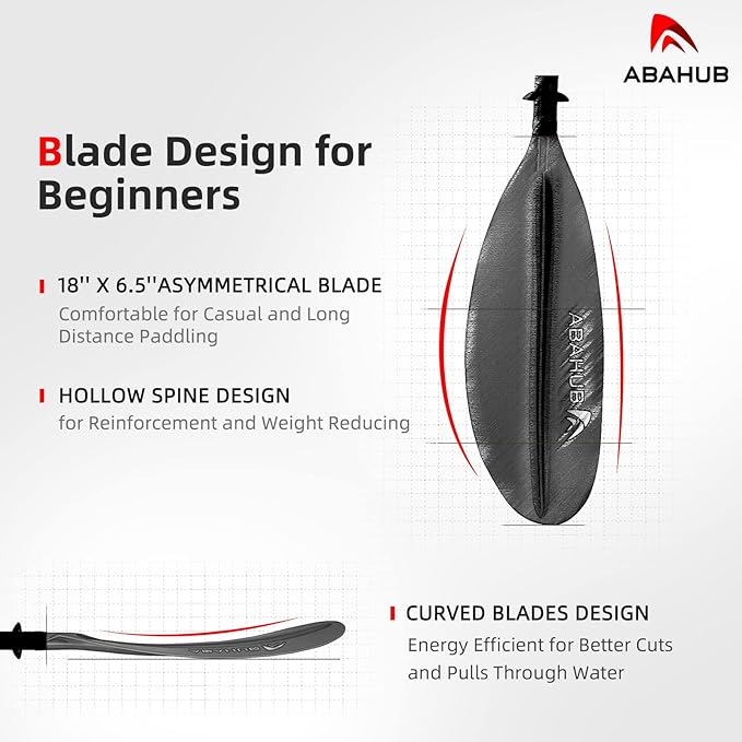 • ENERGY EFFICIENT BLADE DESIGN: With 18'' x 6.5''Asymmetrical blades, this paddle is comfortable and energy saving, both for casual and long distance paddling. The blades are feathered with a hollow spine for reinforcement and less weight. All these add up to better cuts and pulls through water.