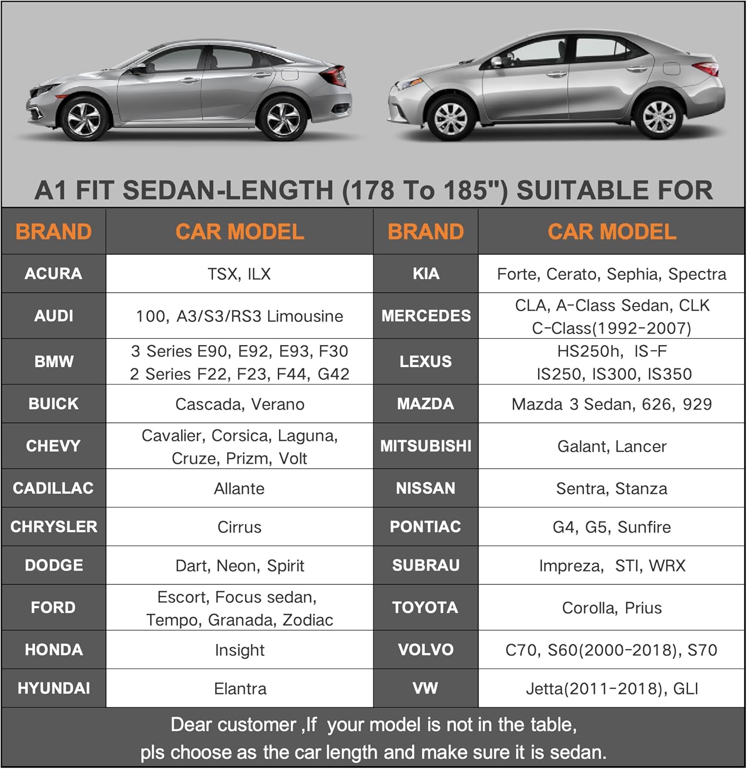 - 【Dimension A1】Universal fit for sedan which length is 178 to185 inch (NOT FOR HATCHBACK AND SUV ). Suitable for Nissan Sentra, Toyota Corolla/ Prius, BMW 3 Series, Ford Focus Sedan,Hyundai Elantra, Kia Forte/Cerato, Lexus IS250/300/350, Mitsubishi Lancer, Subaru Impreza/wrx, VW Jetta etc.
