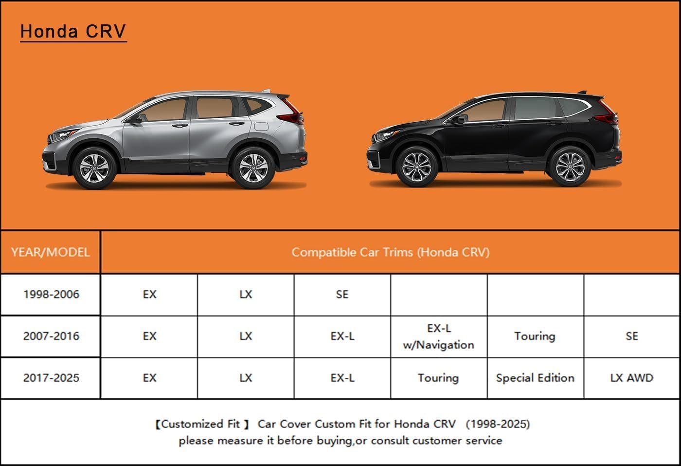- 【Suitable for】— Custom fit for Honda CRV CR-V (1995-2025). Come with a large enough portable bag to store your cover when you do not use.