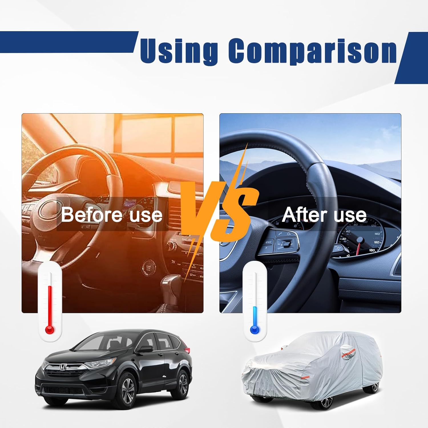 - 【Premium Material】-Kayme 6 layers SUV car cover is made of heavy duty material. 1 PE&PEVA is 100% waterproof, It's great for rainproof snowproofing. 2 High reflective aluminum is good at sunproof and anti-uv, Keep the car cool in the summer. 3 Thicker and soft cotton will protect vehicle painting. Kayme multi-layer material is much thicker and more durable than other similar products.