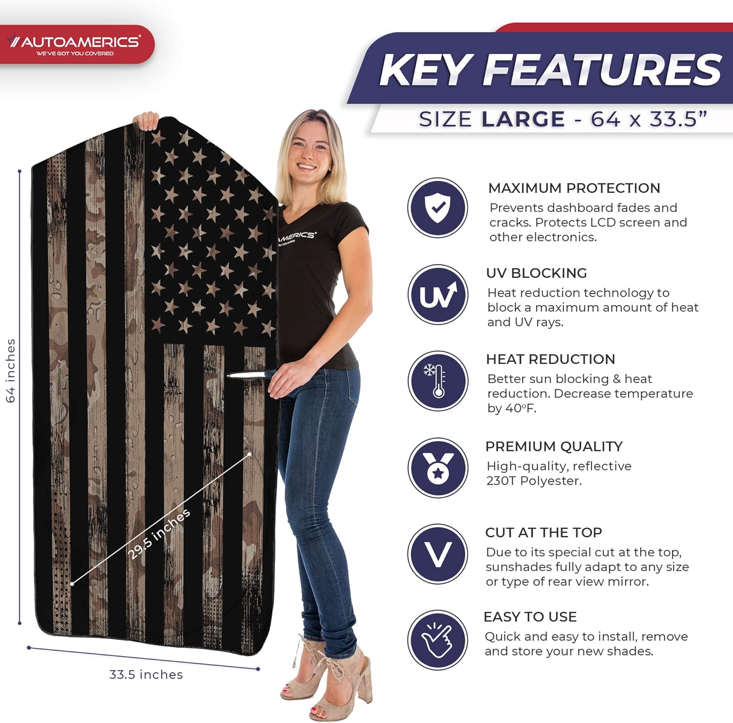 - Market-leading sun protection with an eye-catching American flag design. The new Autoamerics 1 piece USA windshield sunshades combines unbeatable sun reflecting and heat blocking capabilities. We achieve our market-leading protective performance by combining the finest reflective materials and innovative design to reflect the most scorching hot UV rays and heat.