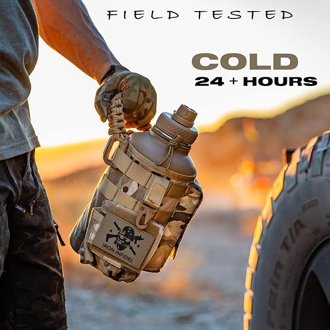 - PATENT PENDING DESIGN - This unique and original design is the only one of its kind. Iron Infidel created and patented this original design with our military, law enforcement, first responders , and hard working patriots in mind. These men and women put in long, hard days and a petite water bottle just won't cut it. Stay hydrated all throughout your hardest days, and you might as well do it with a bottle that looks cool. Grab the 21st century replacement of your old military canteen.
