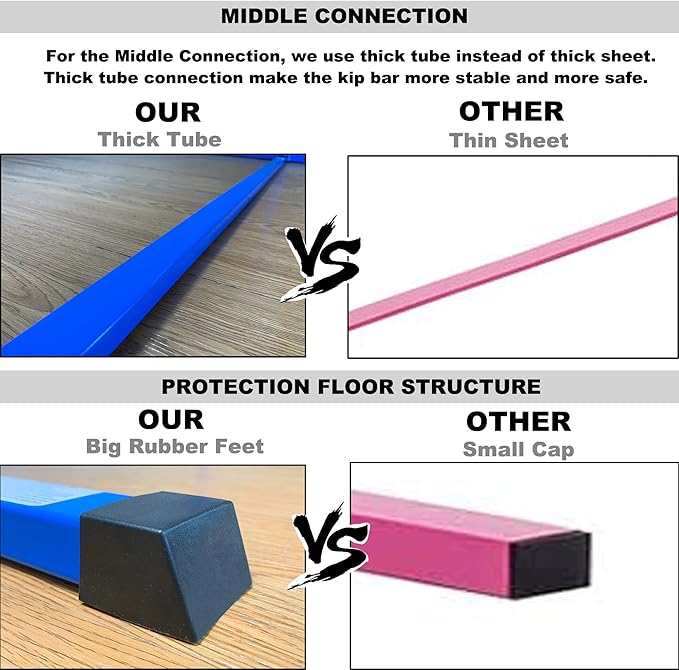 - Safe And Stable Kip Bar For Kids: For this gymnastics bar, there are two knobs, one is locking knob and the other is spring knob, give kids double safety. And instead of rubber cap, we use rubber feet to increase the whole stability of the kip bar set