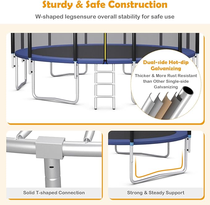 • Easy Installation & Convenient Use: With the installation manual included in the package, you can assemble the trampoline effortlessly. We provide you with six different options (8/ 10/ 12/ 14/ 15/ 16 FT with 42/ 54/ 72/ 80/ 90/ 108 PCS high-extension and rust resistant springs) for choice to satisfy various requirements. Besides, the ladder is equipped with a 2-step ladder for easy access to inner space.