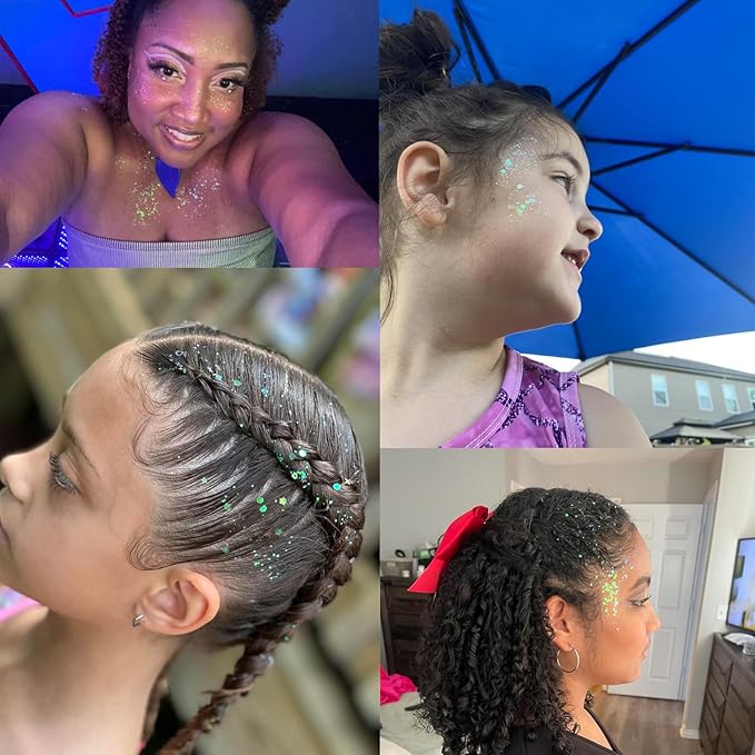 - Wide Applications --- This cosmetic chunky glitter makeup is perfect for your body from head to toe: face,body,lips,cheeks,hair,and more,perfect for rave hair accessories and face glitter rave.On the body, dust some on the collarbones and shoulders for a super shimmering effect