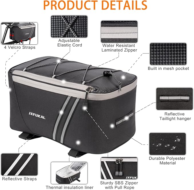 JXFUKAL Rear Bike Rack Bag with Rain Cover, 7L/9L/10L/12L Waterproof Bicycle Ebike Saddle Bag Cycling Pannier Trunk Carrier with Reflector & Adjustable Cord for Commuter Travel Outdoor