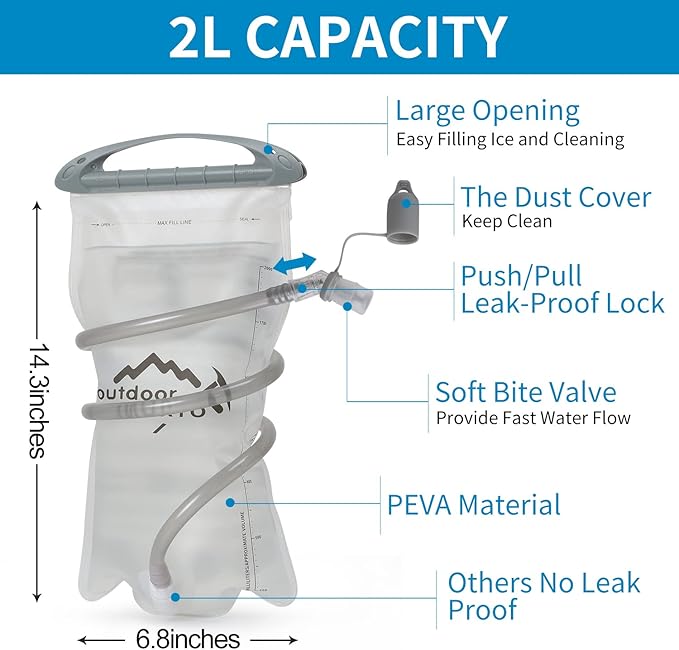 - 🚴【Premium Quality Water Bladder】The Hydration Pack Backpack comes with a 2 liter hydration water bladder and two 250ml soft flask. A switch valve and a cover cap make double leak-proof. Large opening allows quick filling of water and ice and it is easy to clean, the water line (40"length,0.4"diameter) provides a wholesome flow for easy drinking keeps your water tasting fresh, all day. The water temperature is range -20~+50℃.