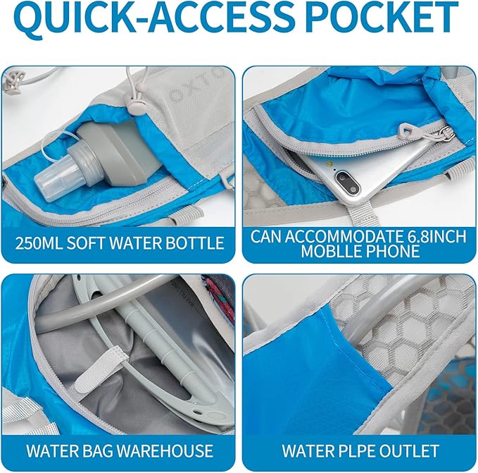- 🚴【Security and Multiple Storage Pocket】Water backpack for hiking Reflective trim for night safety, has multiple pockets can store various necessities outdoor. The bottom front pocket allows you to quickly find what you need during hiking. Smaller quick access items without removing the pack, such as keys, wallet, gadget, sunscreen, phone, towel, or any other items. To travel light, efficient access, let you run faster and farther.