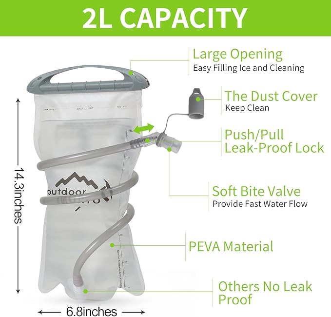 - 🚴【Premium Quality Water Bladder】The Hydration Pack Backpack comes with a 2 liter hydration water bladder and two 250ml soft flask. A switch valve and a cover cap make double leak-proof. Large opening allows quick filling of water and ice and it is easy to clean, the water line (40"length,0.4"diameter) provides a wholesome flow for easy drinking keeps your water tasting fresh, all day. The water temperature is range -20~+50℃.