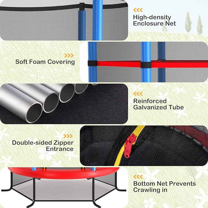 - All Round Enclosure Safety Net: The enclosure safety net of this toddler trampoline is installed inside, protecting kids from getting their hands or feet stuck. Its see-through design also allows you to keep an eye on them conveniently. The entrance provides easy access to trampoline and double-side zippers offer extra protection.