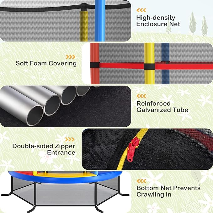 - All Round Enclosure Safety Net: The enclosure safety net of this toddler trampoline is installed inside, protecting kids from getting their hands or feet stuck. Its see-through design also allows you to keep an eye on them conveniently. The entrance provides easy access to trampoline and double-side zippers offer extra protection.