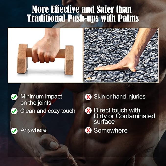 - Triangular Stability System: The push-up bar is design with wide-base geometric structure prevents tipping; Textured wood surface improves grip safety; Even if hands sweat, can no be slip