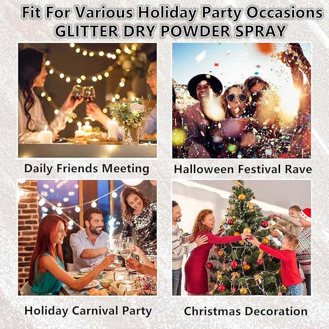 - 【Perfect for Party Festival Body Face Highlighter】Perfect for masquerade club, rave, festival, birthday.The stunning glitter makes you stand out in themed parties, masquerade and all kinds of festive carnival occasions, adding more charm and beauty to you.Glitter Powder Spray for Christmas Decorations and so on.
