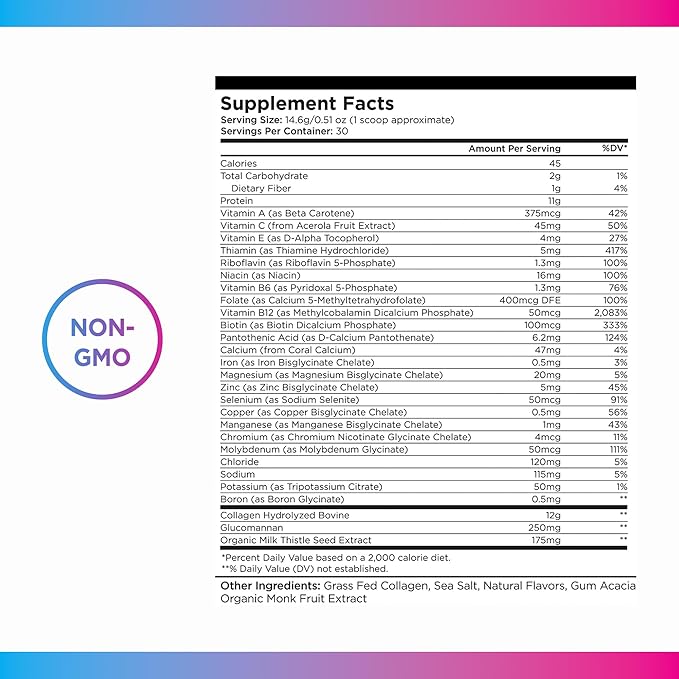 - Special Ingredients : Vitamin A (as Beta Carotene), Vitamin C (from Acerola Fruit Extract), Vitamin E (as D-Alpha Tocopherol), Thiamin (as Thiamine Hydrochloride), Riboflavin (as Riboflavin 5-Phosphate), Niacin (as Niacin), Vitamin B6 (as Pyridoxal 5-Phosphate), Folate (as Calcium 5-Methyltetrahydrofolate), Vitamin B12 (as Methylcobalamin Dicalcium Phosphate), Biotin (as Biotin Dicalcium Phosphate), Pantothenic Acid (as D-Calcium Pantothenate), Calcium (from Coral Calcium), Iron (as Iron Bisglycinate Chelate), Magnesium (as Magnesium Bisglycinate Chelate), Zinc (as Zinc Bisglycinate Chelate), Selenium (as Selenium Chelate), Copper (as Copper Bisglycinate Chelate), Manganese (as Manganese Bisglycinate Chelate), Chromium (as Chromium Nicotinate Glycinate Chelate), Molybdenum (as Molybdenum Glycinate), Chloride, Sodium, Potassium (as, Tripotassium Citrate), Boron (as Boron Glycinate), Collagen Hydrolyzed Bovine, Glucomannan, Organic Milk Thistle Seed Extract, Grass Fed Collagen, Sea Salt, Natural Flavors, Gum Acacia, Organic Monk Fruit Extract Vitamin A (as Beta Carotene), Vitamin C (from Acerola Fruit Extract), Vitamin E (as D-Alpha Tocopherol), Thiamin (as Thiamine Hydroch… See more