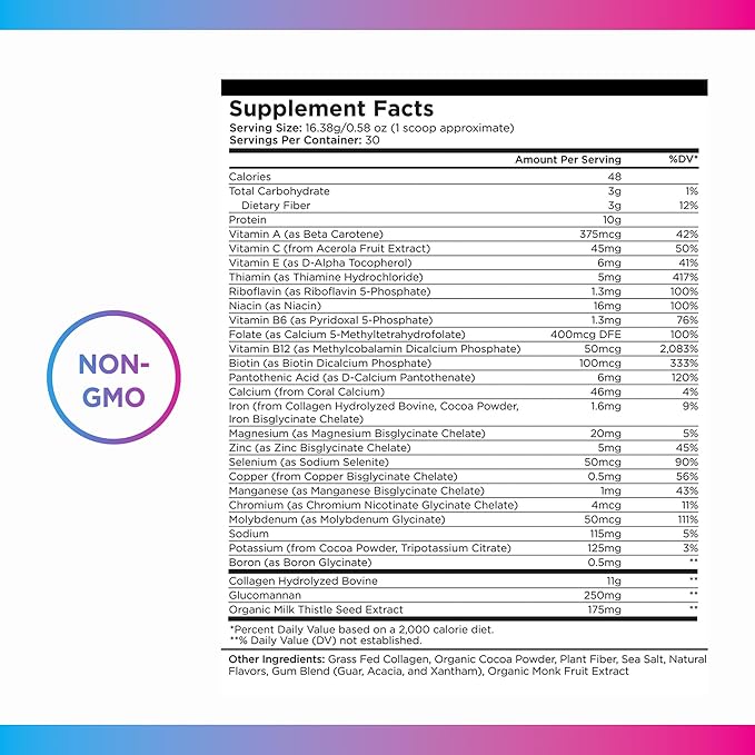 - Special Ingredients : Vitamin A (as Beta Carotene), Vitamin C (from Acerola Fruit Extract), Vitamin E (as D-Alpha Tocopherol), Thiamin (as Thiamine Hydrochloride), Riboflavin (as Riboflavin 5-Phosphate), Niacin (as Niacin), Vitamin B6 (as Pyridoxal 5-Phosphate), Folate (as Calcium 5-Methyltetrahydrofolate), Vitamin B12 (as Methylcobalamin Dicalcium Phosphate), Biotin (as Biotin Dicalcium Phosphate), Pantothenic Acid (as D-Calcium Pantothenate), Calcium (from Coral Calcium), Iron (from Collagen Hydrolyzed Bovine, Cocoa Powder, Iron Bisglycinate Chelate), Magnesium (as Magnesium Bisglycinate Chelate), Zinc (as Zinc Bisglycinate Chelate), Selenium (as Selenium Chelate), Copper (from Copper Bisglycinate Chelate), Manganese (as Manganese Bisglycinate Chelate), Chromium (as Chromium Nicotinate Glycinate Chelate), Molybdenum (as Molybdenum Glycinate), Chloride, Sodium, Potassium (from Cocoa Powder, Tripotassium Citrate), Boron (as Boron Glycinate), Collagen Hydrolyzed Bovine, Glucomannan, Organic Milk Thistle Seed Extract, Grass Fed Collagen, Organic Cocoa Powder, Sea Salt, Natural Flavors, Gum Acacia, Organic Monk Fruit Extract Vitamin A (as Beta Carotene), Vitamin C (from Acerola Fruit Extract), Vitamin E (as D-Alpha Tocopherol), Thiamin (as Thiamine Hydroch… See more