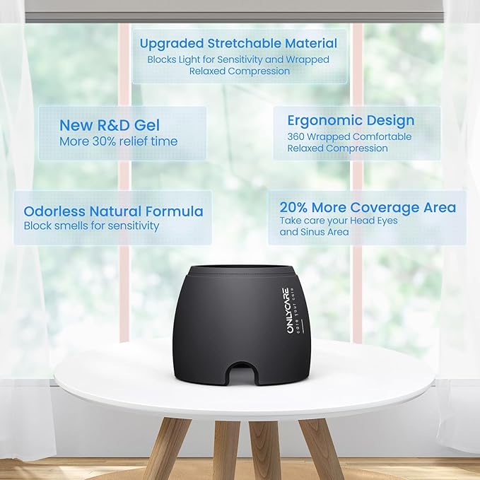 ONLYCARE Migraine Relief Cap, Upgraded Odorless Headache Relief Cap, 360° Gel Surround Ice Pack Mask for Migraine, Sinus, Stress, Frontal Headaches (Black)