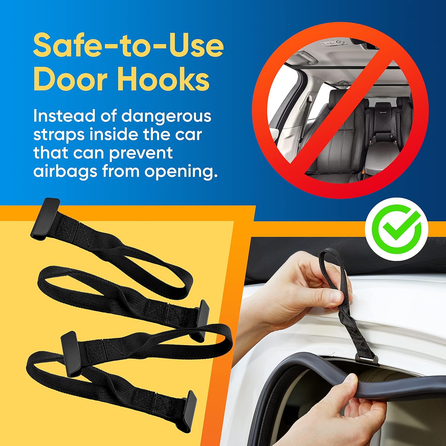 - ENSURE YOUR TRAVEL GOES SMOOTHLY. Your safety is our number one priority, so we took special care designing our car top carrier to guarantee you smooth sailing. Extremely durable, the bag has heavy-duty straps and safe-to-use door hooks. Some vehicle cargo carriers are fastened with straps that go inside the car, but that could be quite dangerous because they can prevent airbags from opening properly. Our high-quality cargo carrier bag with reliable equipment will ensure you travel safely.